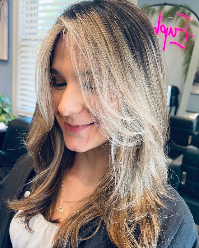 Face-framing platinum highlights add brightness where it matters, highlighting your features with cool, blonde tones. These highlights give the face a fresh, flattering glow, blending seamlessly with the rest of the hair to create a natural yet attractive effect. Perfect if you want a little pop without the platinum commitment.