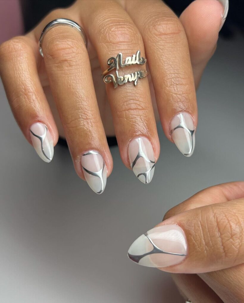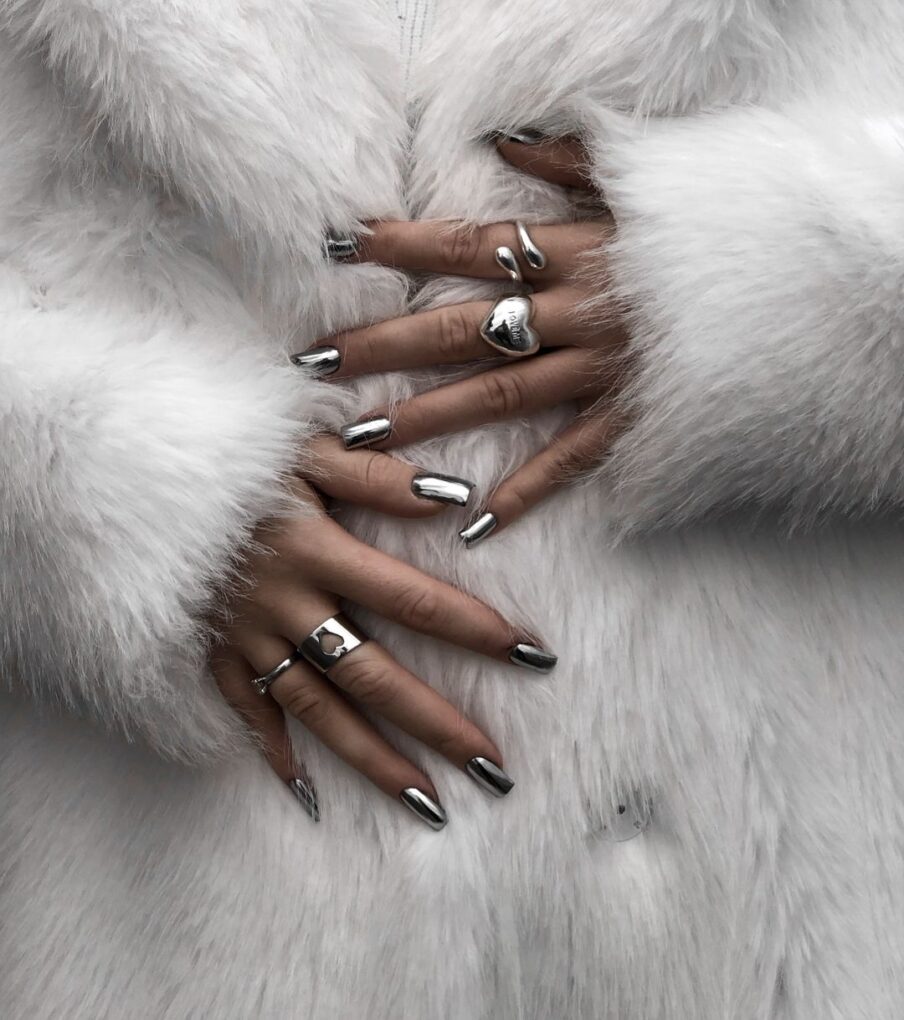 Silver Chrome will add a futuristic touch to your winter nails with a mirror-like hue that reflects the icy allure of the season, creating a vibrant and modern aesthetic. This sleek nail trend exudes confidence and sophistication, making a bold statement that easily turns heads.