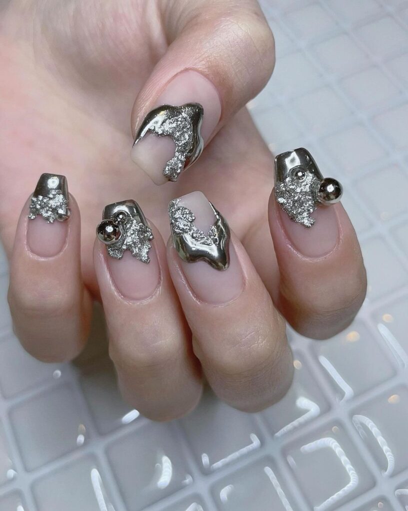 3D Dripping Silver makes a bold statement with a molten silver design that adds an edge to your winter manicure. This avant-garde nail art exudes luxury and creativity, highlighting the modern sophistication of your fingertips.