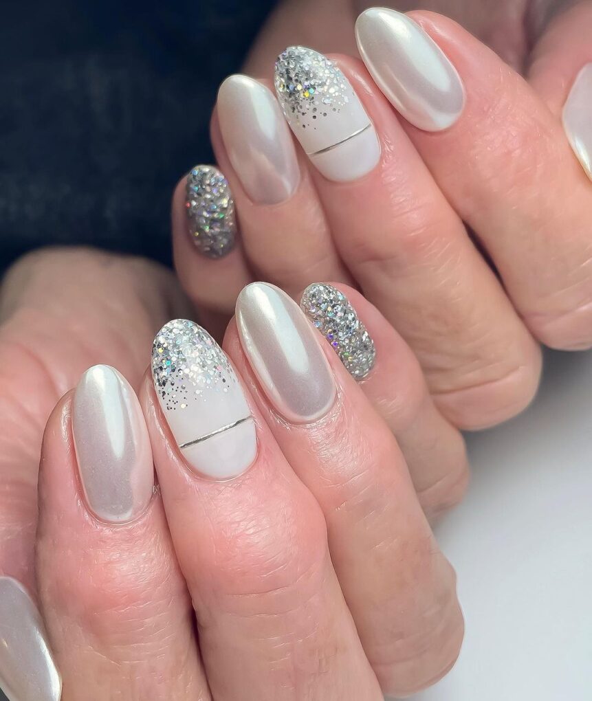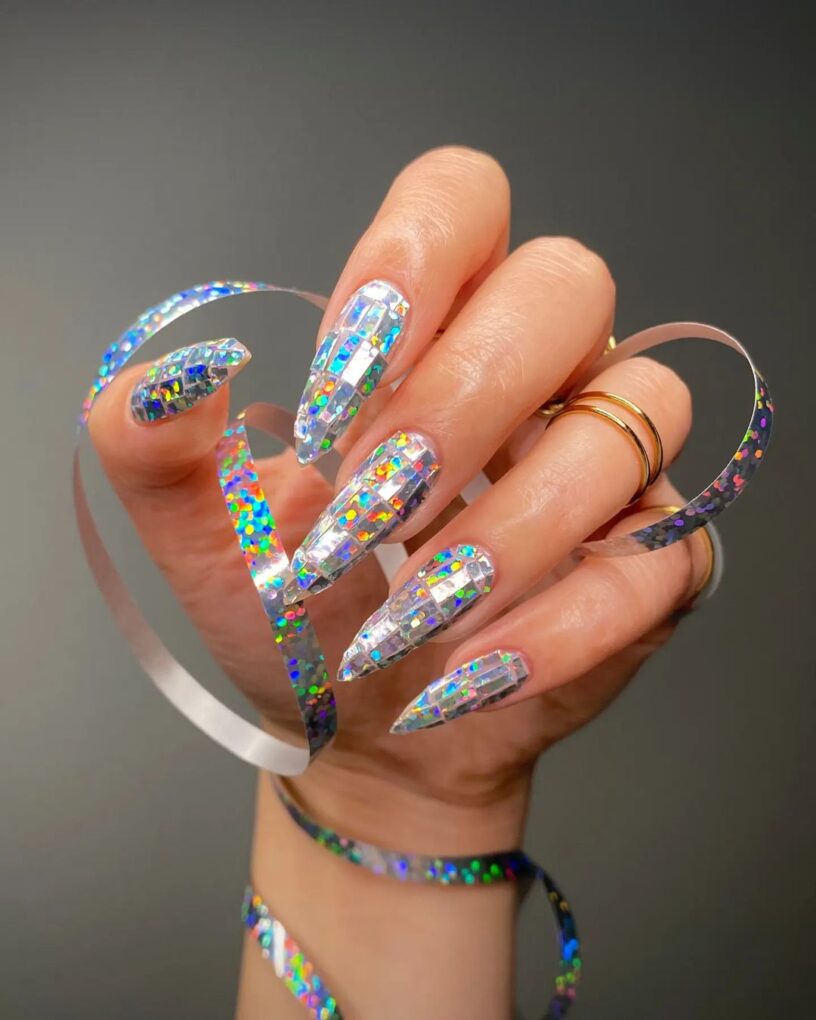 New Year’s nails create a festive atmosphere with their sparkling silver shades and are ideal for celebrating the New Year in style. This nail design exudes celebration and glamor, making your manicure shine bright as you welcome the start of a new chapter.