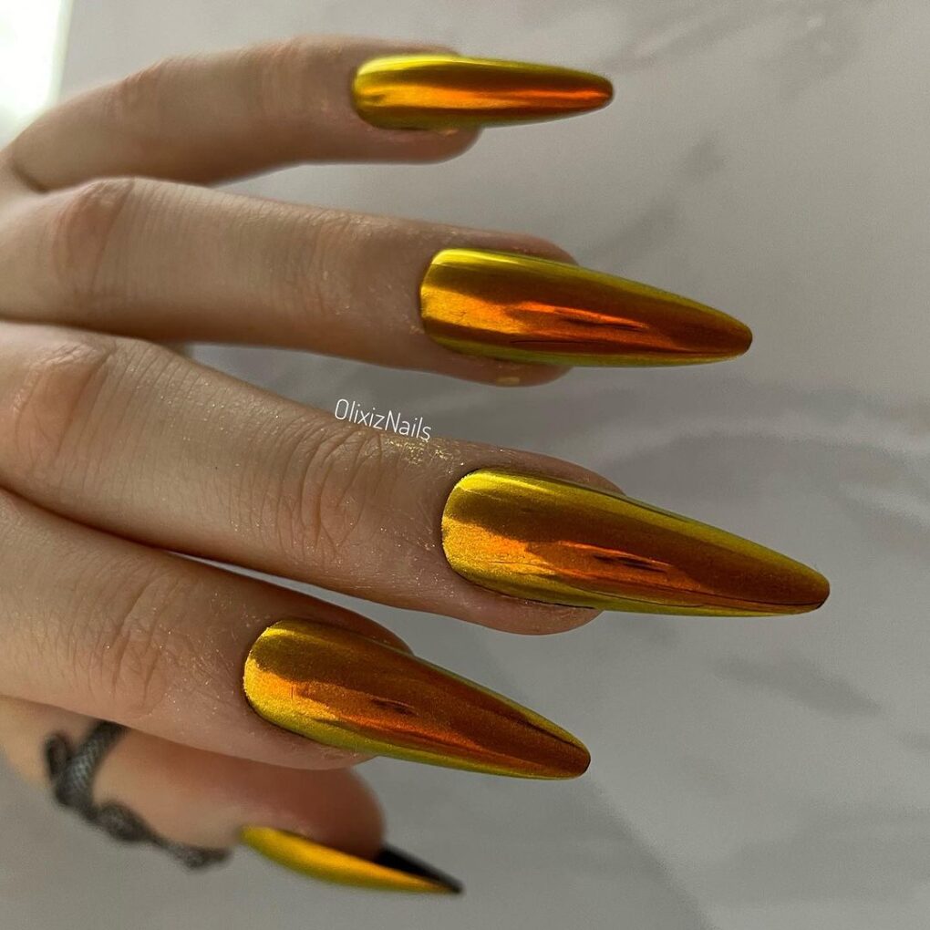 Create a sleek and futuristic look with Mirror Gold Chrome nails that reflect light with every movement for a stunning and eye-catching effect. Ring in the new year with nails that exude sophistication and modernity, making a statement wherever you go.