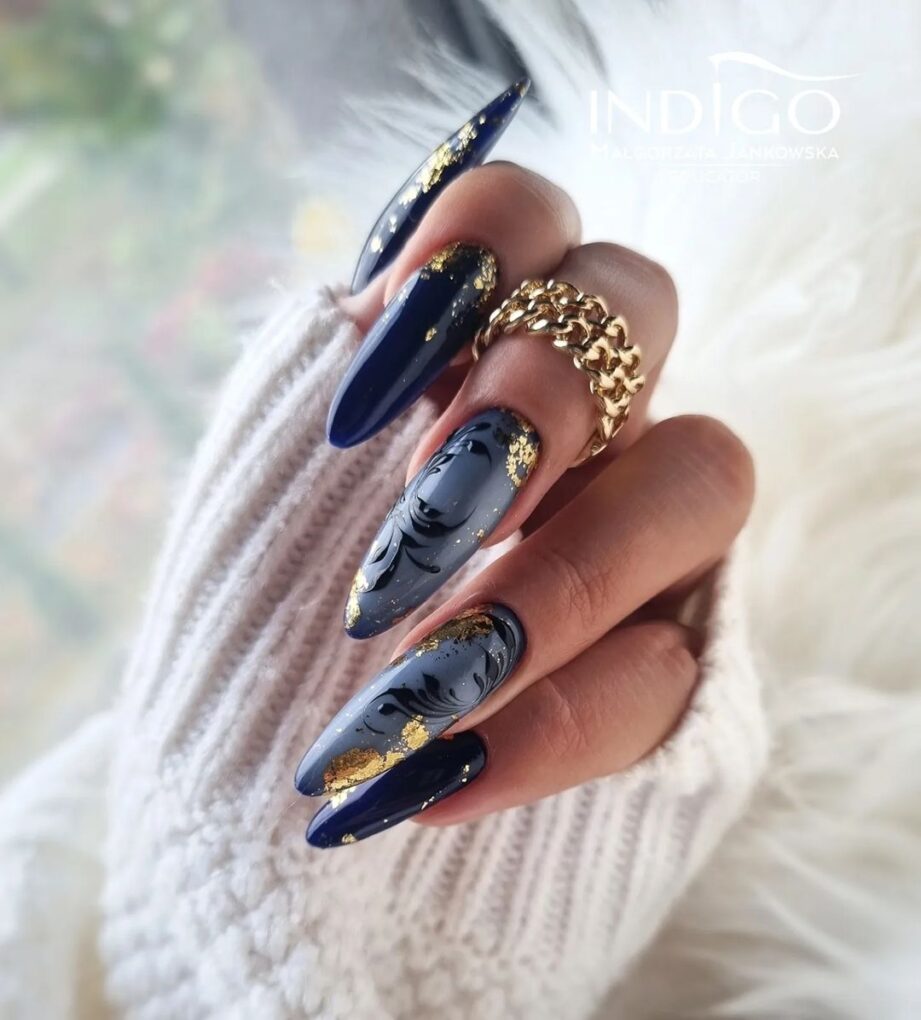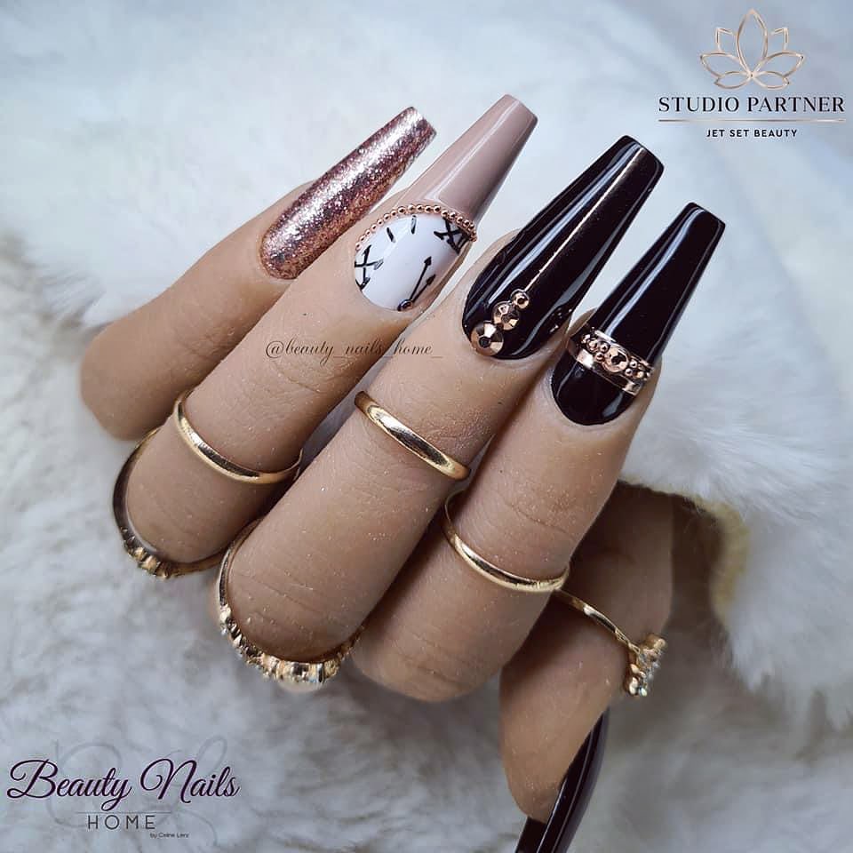 Consider adorning your nails with stunning black and gold designs to give them timeless elegance. These contrasting colors create a luxurious and sophisticated look, perfect for ringing in the New Year with unmatched style and glamour.