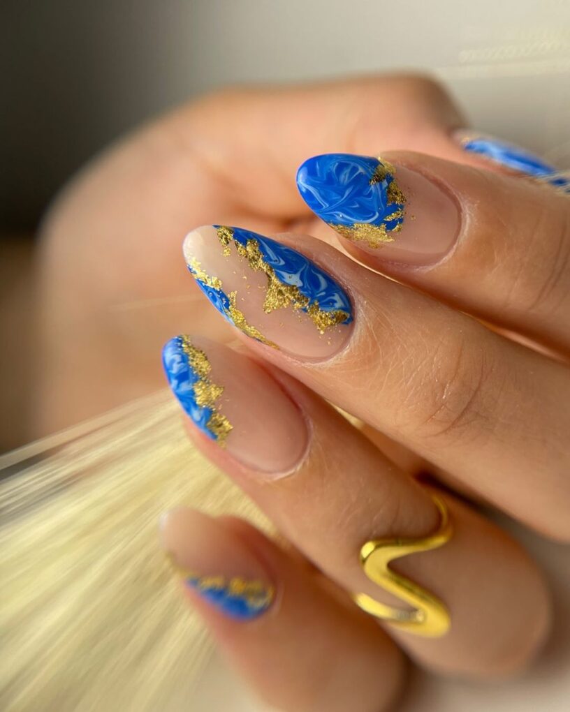 With golden waves and ocean hues, your gilded nails with ocean powder are a trip into a luxurious underwater fantasy.