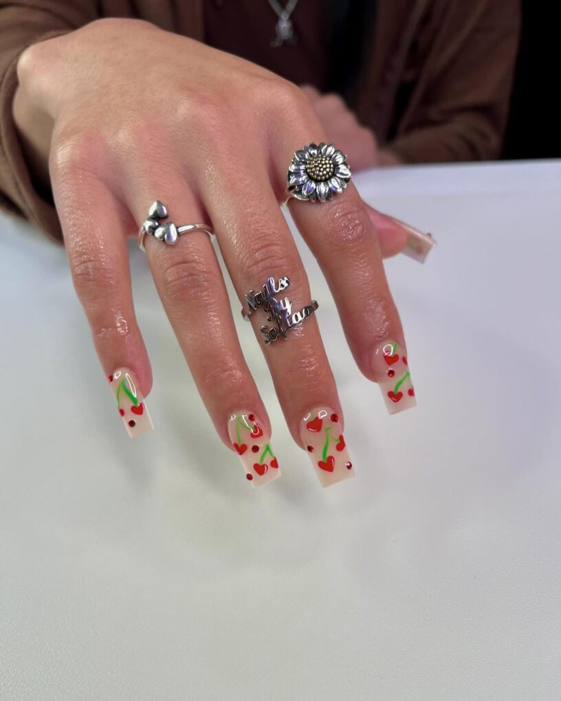 Savor the sweetness of style with medium-length Cherries nails, where each fingertip becomes a delightful canvas.