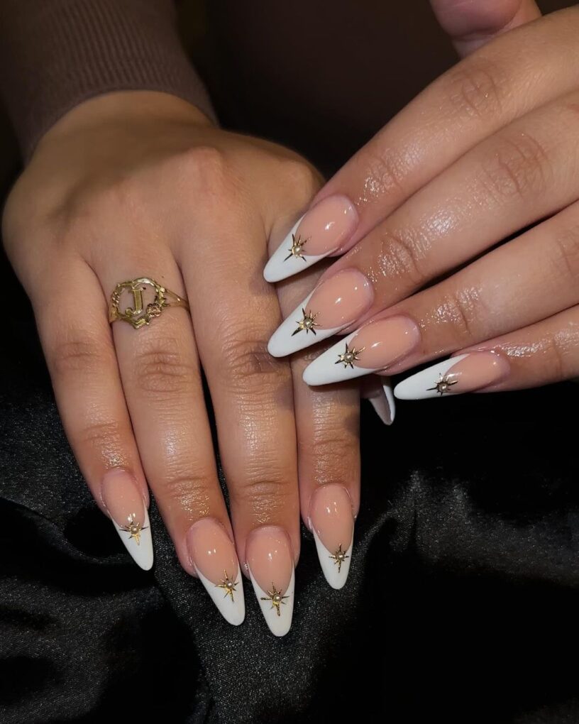 Create an elegant look with white mid-length stiletto nails, where each nail exudes confidence and sophisticated style.