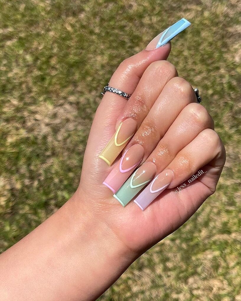 Capture the essence of elegance with medium length pastel French nails, turning your manicure into a subtle and sophisticated art.