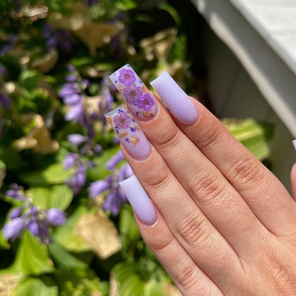 Experience a combination of natural beauty and chic sophistication with medium length nails adorned with delicate purple dried flowers, transforming each fingertip into a masterpiece blooming with timeless elegance.