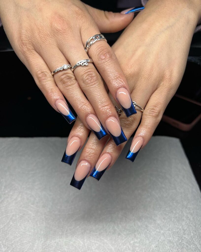 Give your nails a touch of futuristic elegance with medium length nails with blue chrome tips that transform each fingertip into a sleek metallic masterpiece.