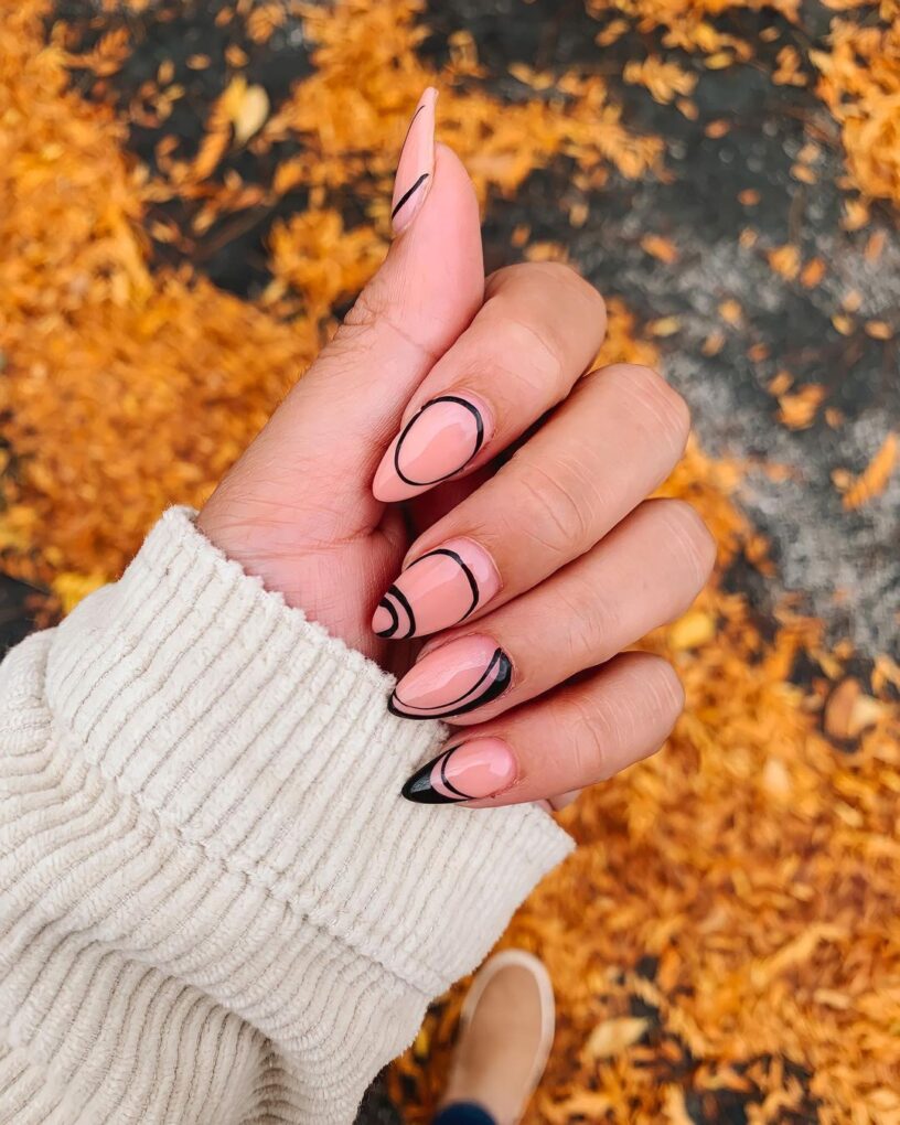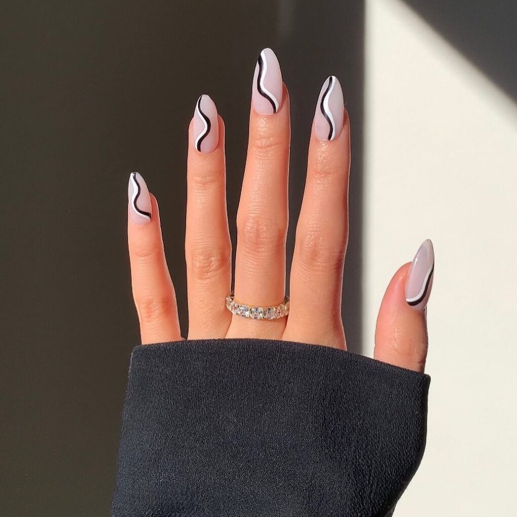 Decorate medium-length nails with avant-garde sophistication with abstract, sinuous black lines that transform each fingertip into a mesmerizing canvas of contemporary and artistic expression.