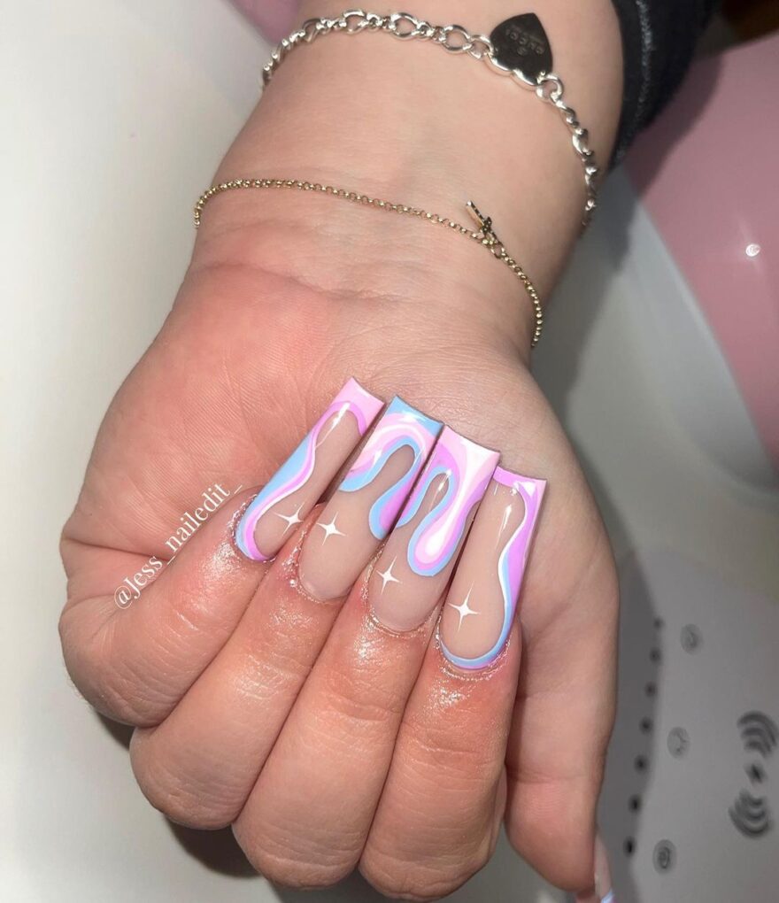 Create a dreamy and whimsical allure with pastel swirls on medium-length nails, turning each fingertip into a canvas of delicate and enchanting beauty.