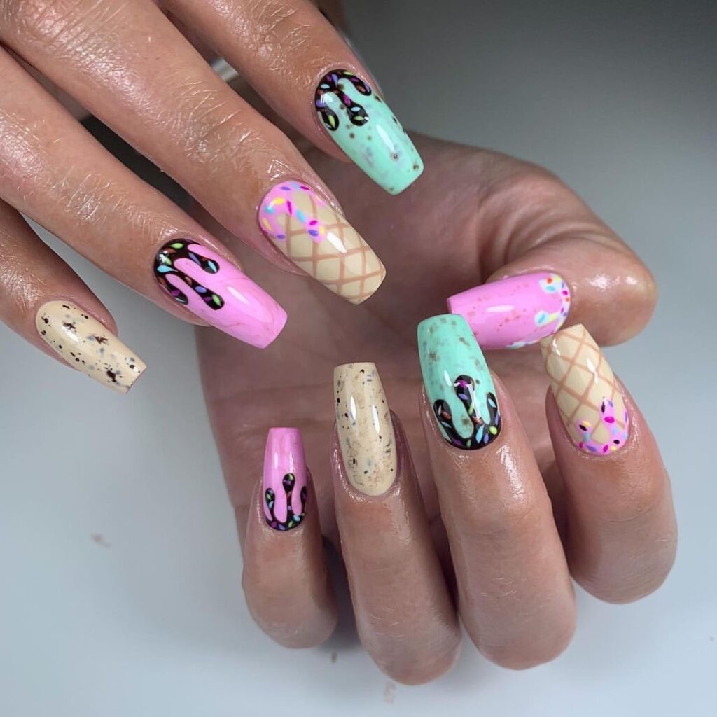 Add a touch of sweetness to your medium-length nails with the Ice Cream Treat theme, transforming each fingertip into a delicious and whimsical canvas inspired by the delicious world of frozen treats.