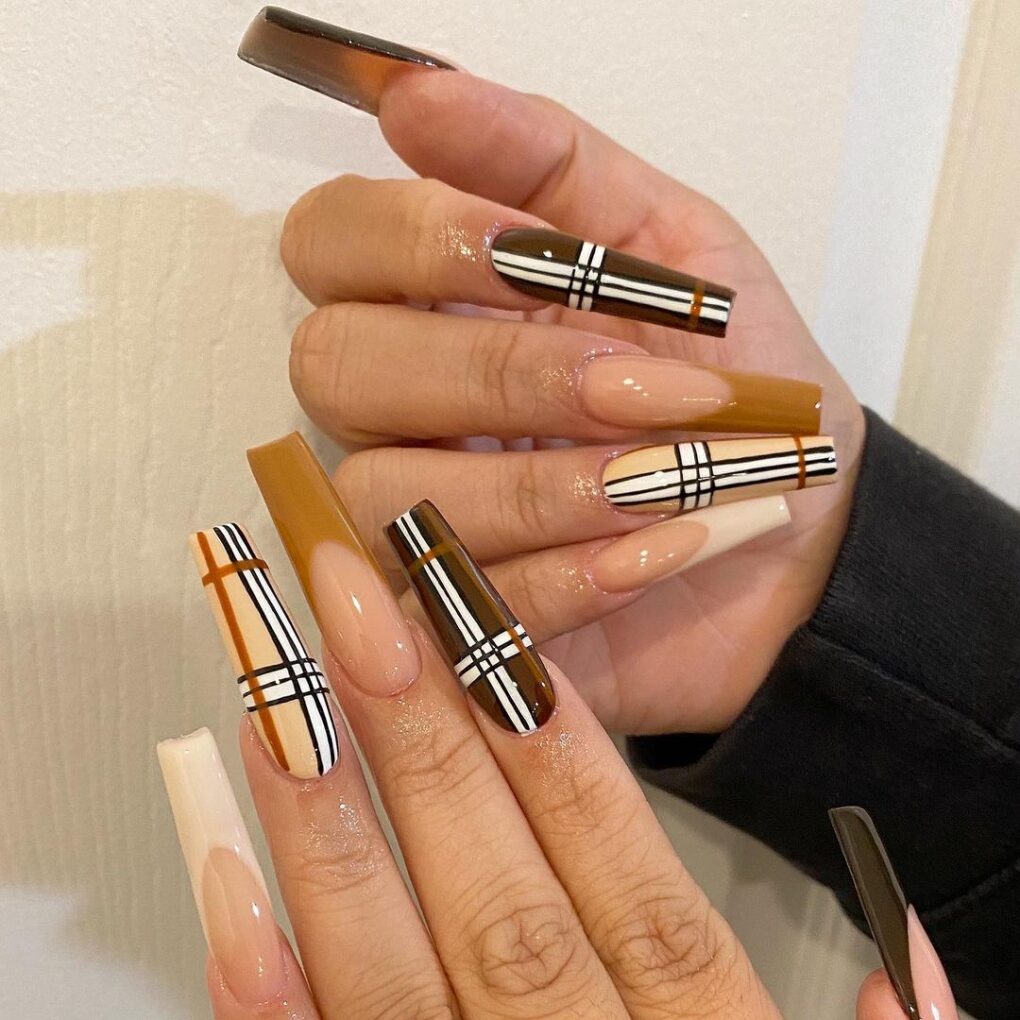 Make a bold style statement this November with the “Glossy Plaid” nail design, which combines classic plaid patterns with a sleek, glossy finish, adding a modern and sophisticated twist to a timeless seasonal favorite.
