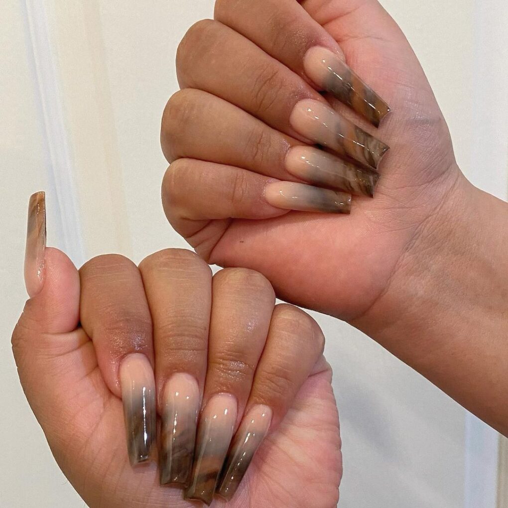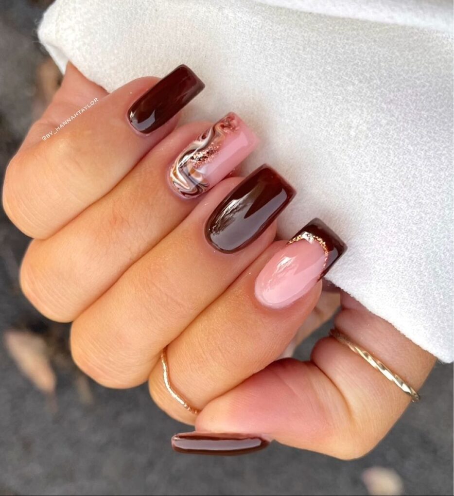 Embrace the cozy embrace of the season with “Mocha Melt,” where creamy coffee tones blend seamlessly with subtle chocolate swirls to create a November nail design that exudes warmth and decadence.