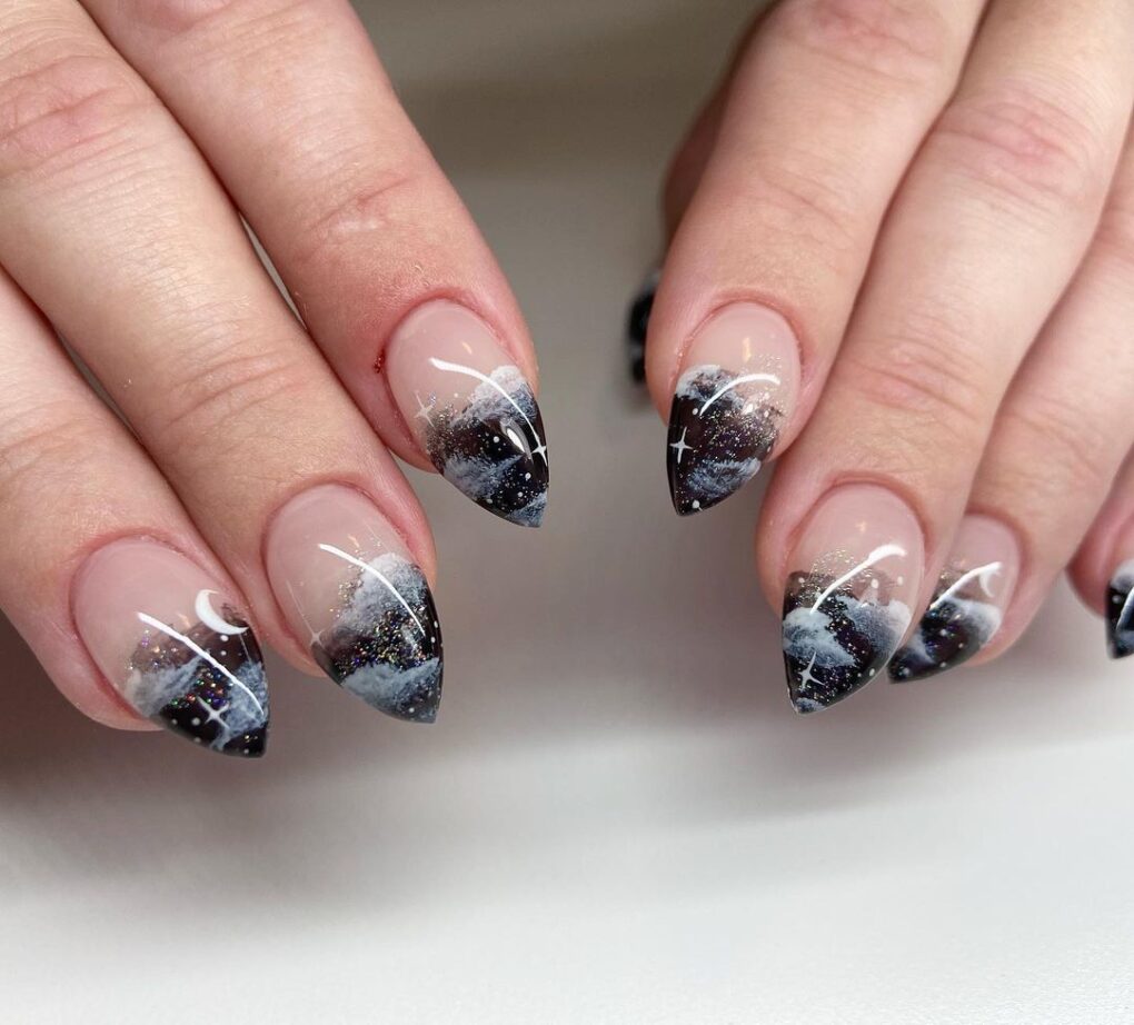 Dreamy and celestial, Celestial Nails transports your fingertips to the cosmic realm of November with enchanting constellations, metallic accents and dark hues creating an otherworldly allure and a sophisticated touch.