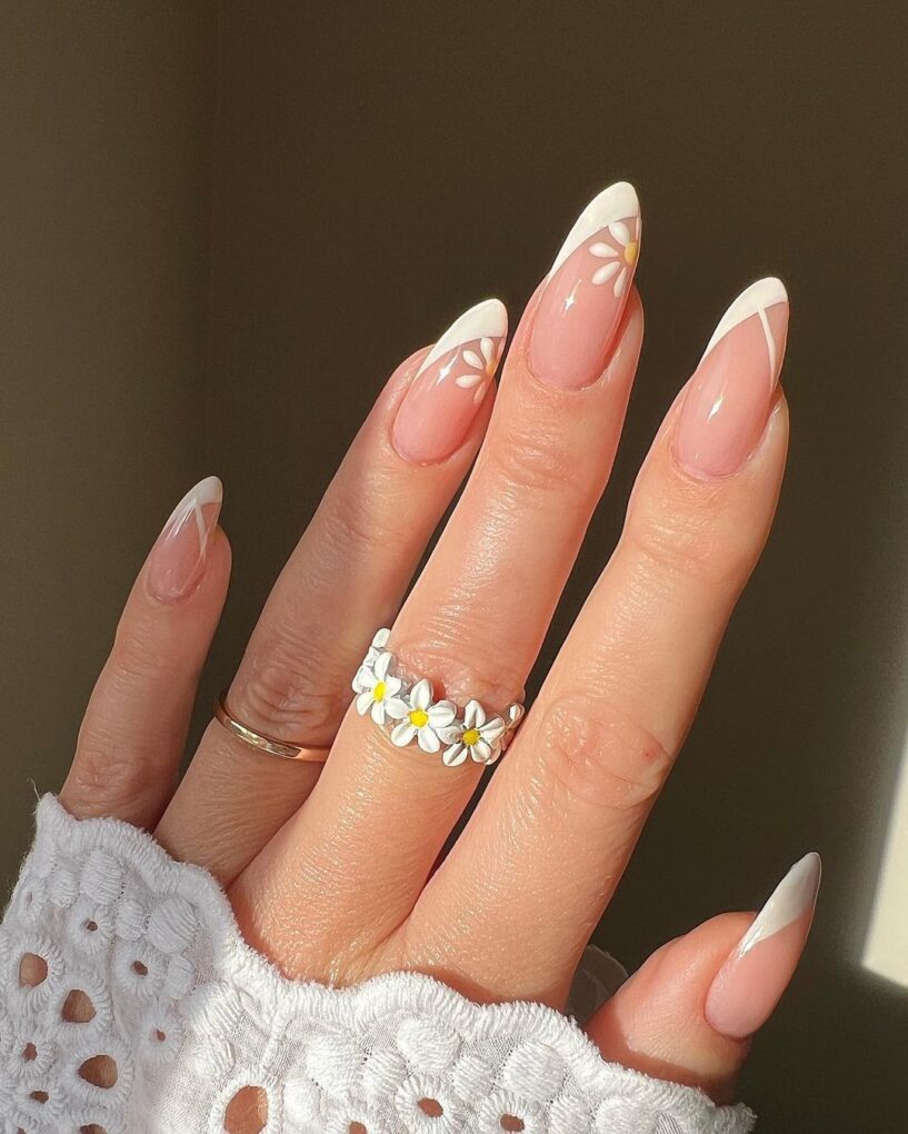 Enhance your spring style with White French Daisies by intricately incorporating delicate daisies into a chic white French manicure, adding a touch of floral sophistication to your fingertips.