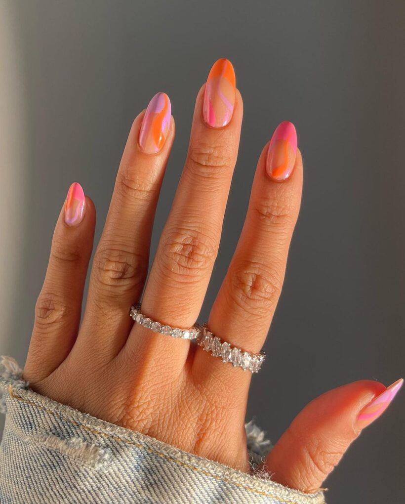 Add a playful twist to your manicure with Pastel Tips + Orange Swirl, expertly mixing pastel shades and swirls of bright orange to create a dynamic and lively nail design that exudes the essence of a blooming spring.