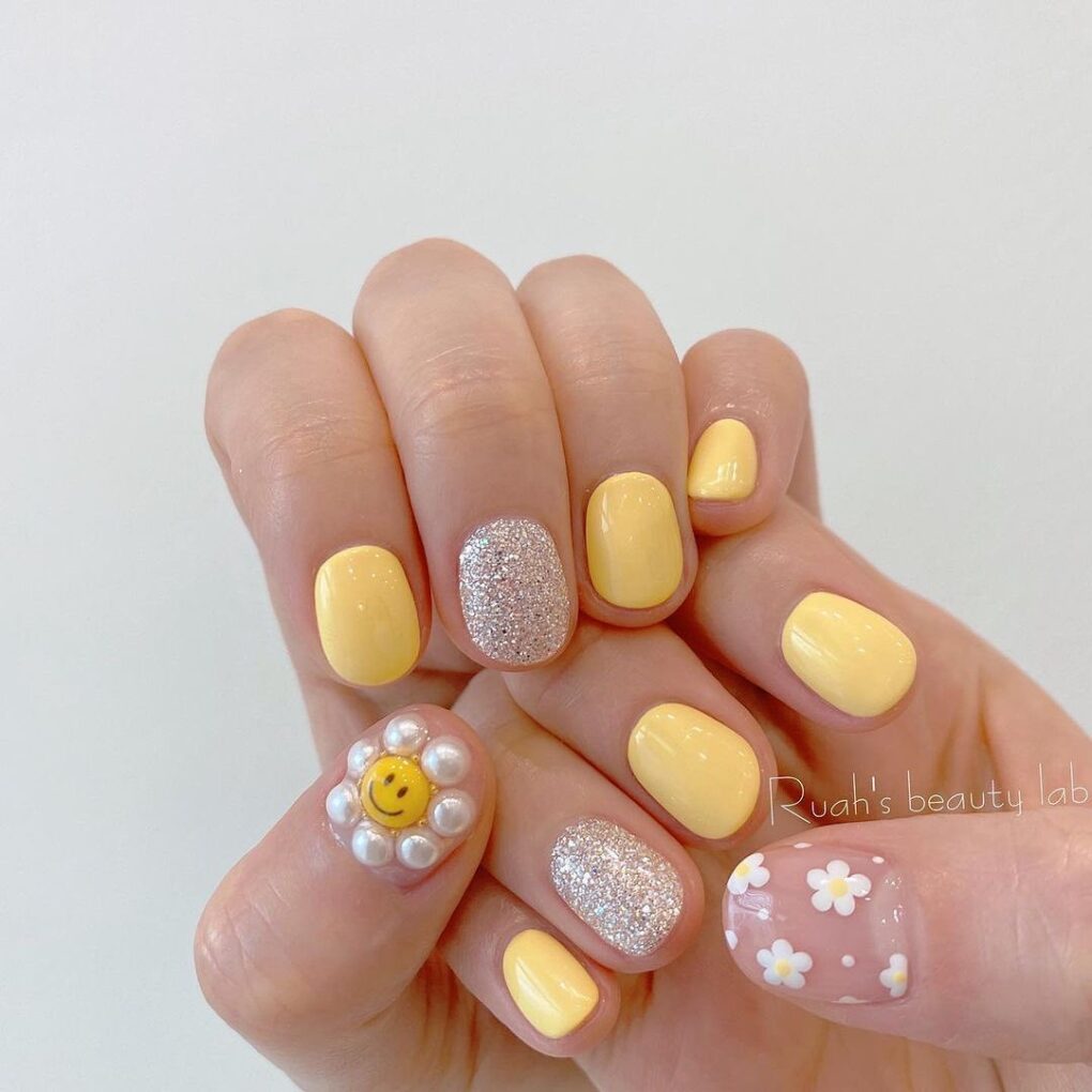 Give your nails a splash of sunshine with Yellow and Daisies It Is, easily pairing cheerful yellow hues with hand-painted daisies for a bright and cheerful spring manicure.