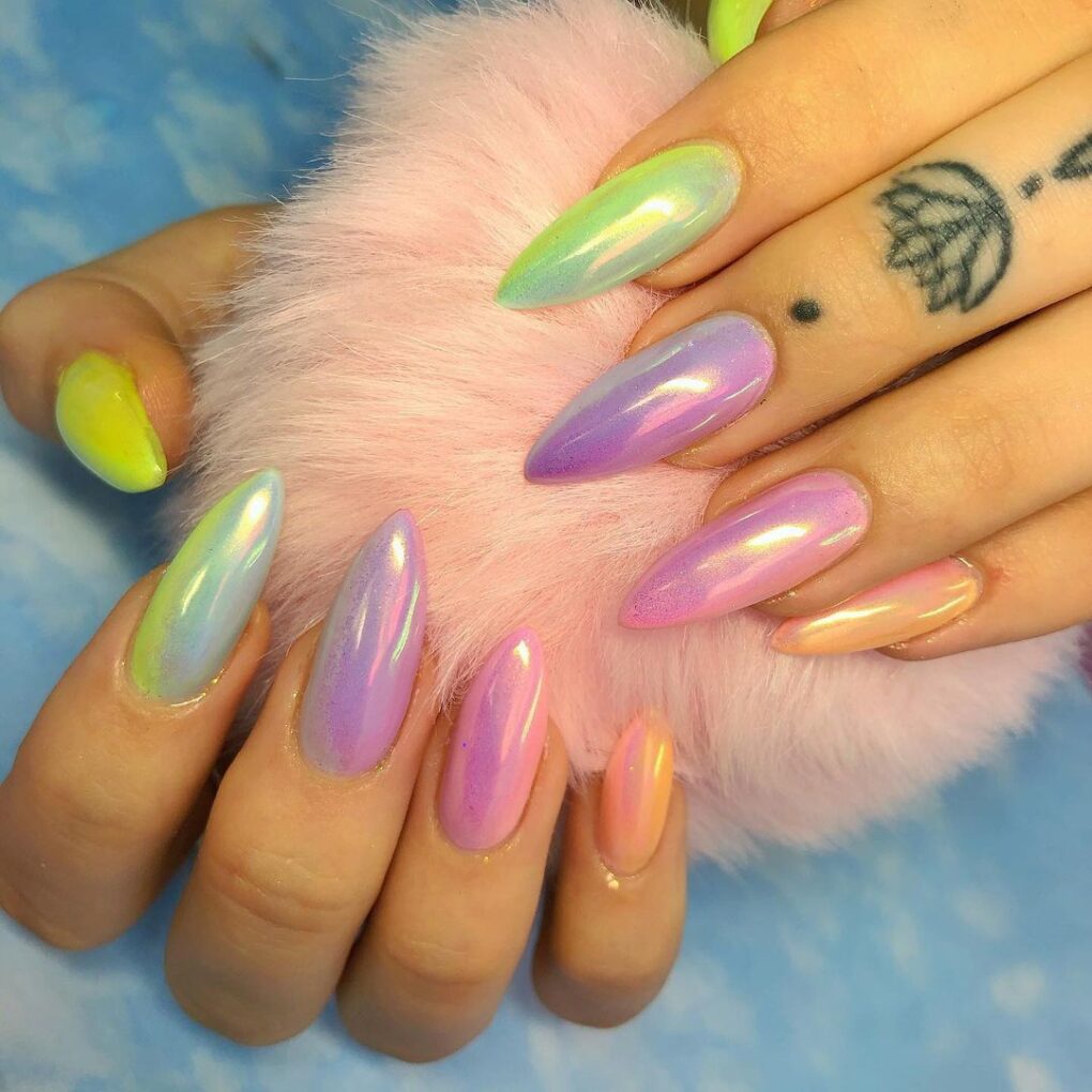 Transform your nails into a celestial canvas with Rainbow Sky, expertly mixing shimmering tones to mimic the ever-changing hues of a spring sunset, creating a dreamy and ethereal manicure that captures the charm of the season.