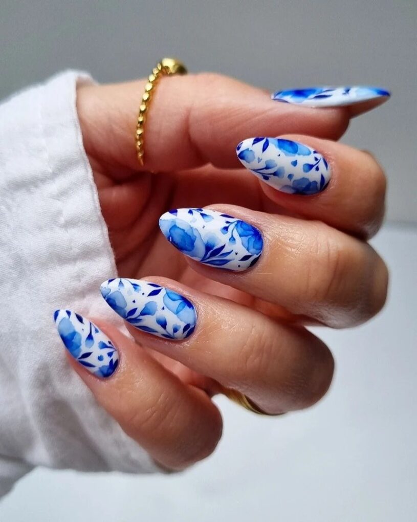 Immerse your nails in a sea of tranquility with the Blue Floral design, which skillfully interweaves shades of blue to create a serene and elegant manicure that captures the essence of a blooming spring garden.