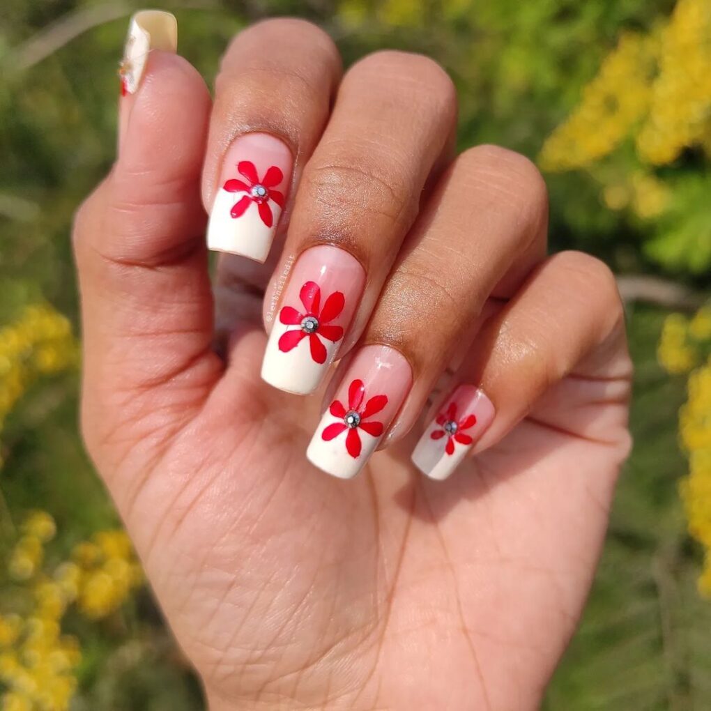 Transform your nails into a garden of elegance with the Crimson Petal of Spring design, which delicately combines vibrant red flowers with a classic white French tip, creating a sophisticated and timeless manicure that epitomizes the beauty of spring.