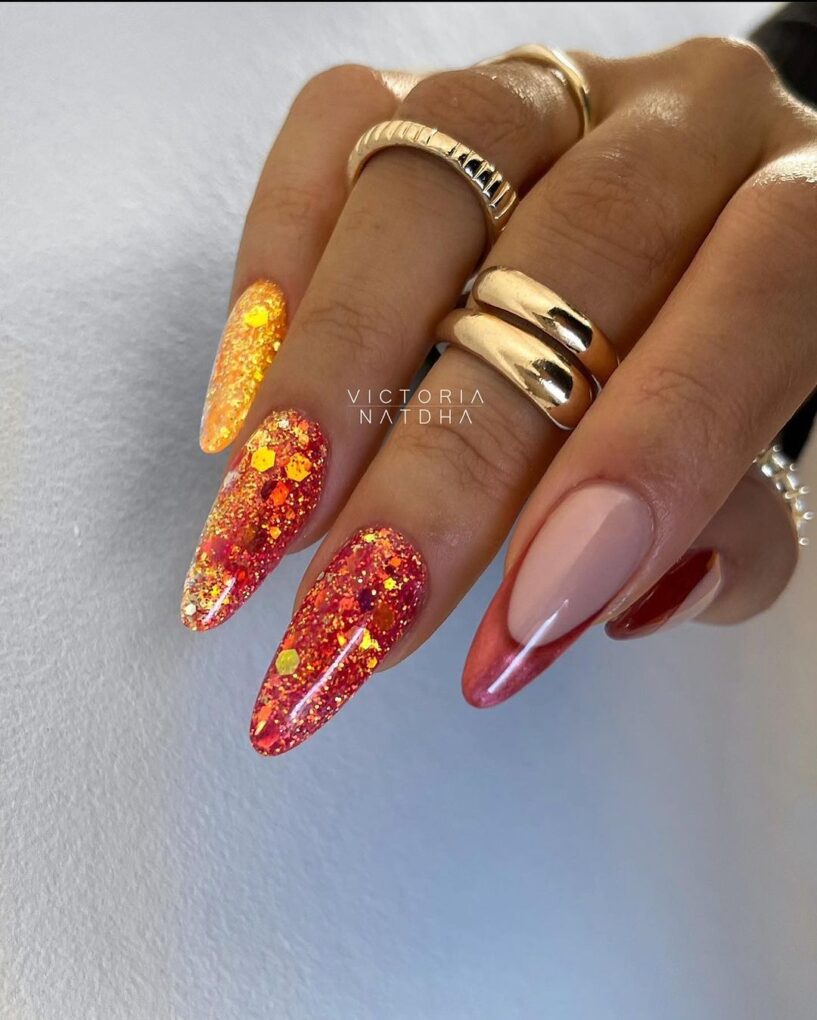 Set your nails on fire with the Spicy Spring Sequins design, which artfully combines bright hues and sparkling glitter to create a vibrant and sophisticated manicure that embodies the spirit of spring.