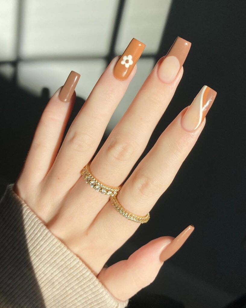 Give your nails a touch of nature-inspired elegance with the Cocoa Daisy design, which delicately combines brown tones with hand-painted daisies to create a sophisticated and earthy manicure that captures the essence of spring.